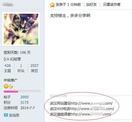 再來(lái)說(shuō)說(shuō)論壇外鏈,論壇的互動(dòng)性極強(qiáng),通常是以發(fā)帖回帖的形式吸引用戶的參與,但是這種方式能給網(wǎng)站帶來(lái)權(quán)重或流量嗎?答案是肯定的,奇億小編舉個(gè)自身在tui18論壇發(fā)帖的例子,相信大家就明白了。論壇帖子,通常會(huì)收到“支持樓主”、“感謝分享”等等這一類的回復(fù),這時(shí)別人有沒(méi)有用心看你的文章似乎顯得不太重要,他們這樣做的目的主要還是外鏈。除了本身發(fā)帖可以添加外鏈,論壇簽名一般可以帶上鏈接,只要你參與回帖,又可獲得一個(gè)外鏈的機(jī)會(huì)。效果較好的外鏈論壇有:tui18,阿里,seo論壇,新浪等。